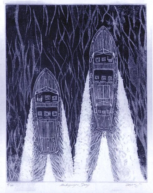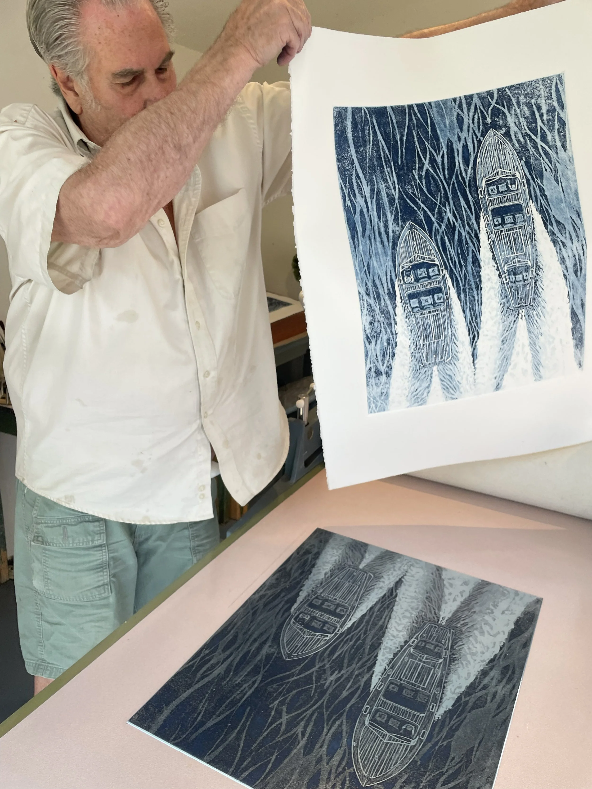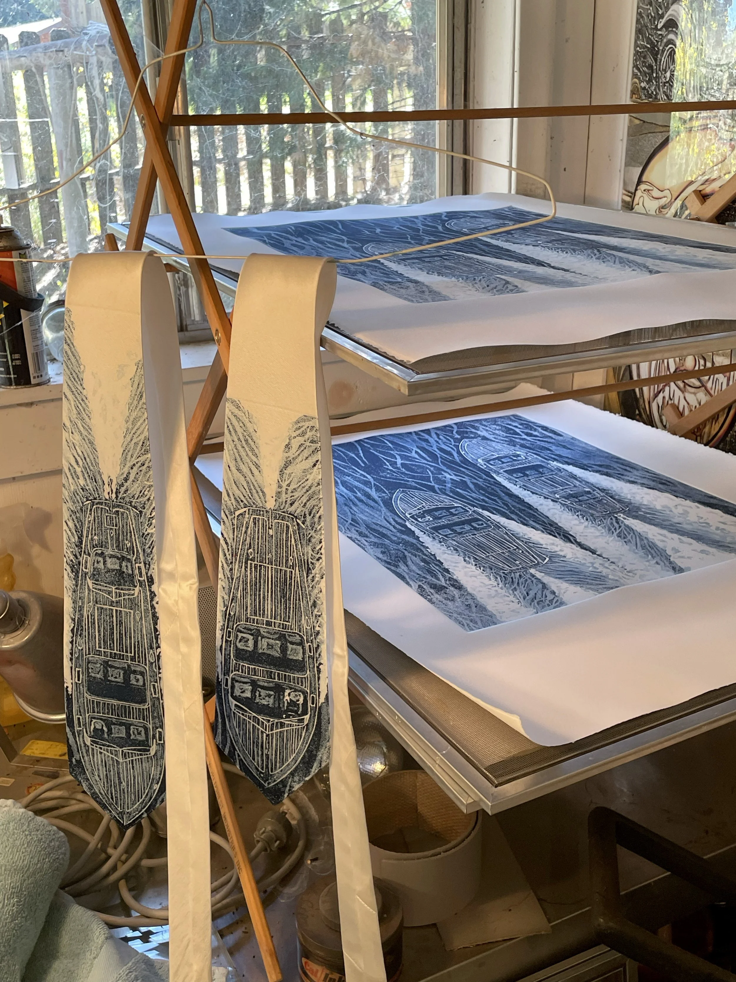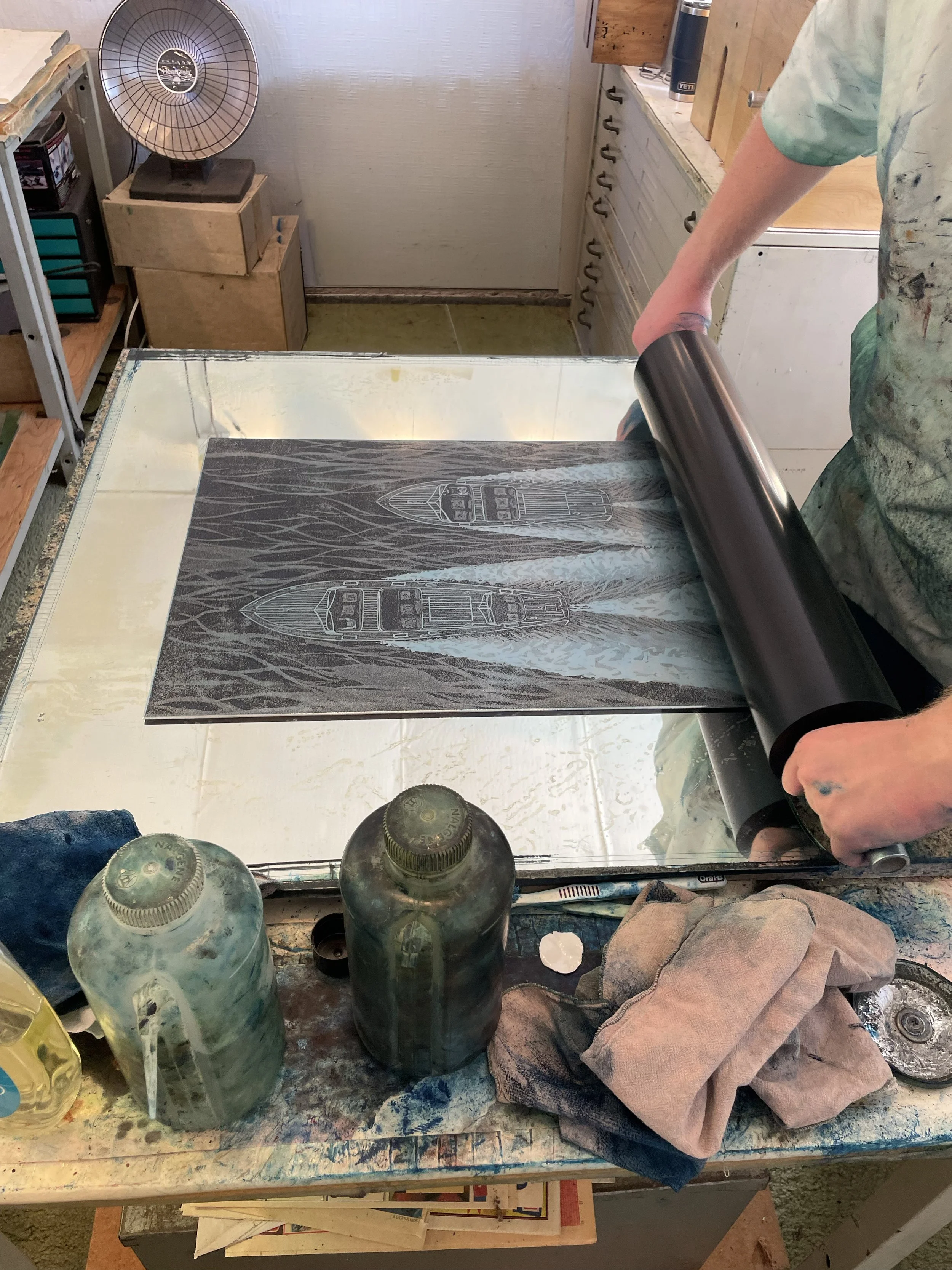 Roy’s printmaking studio—Foulbite Press—is nestled comfortably in the woods behind his house in Chicago Park, California. Here, Roy creates, inks, and hand prints his custom etchings and linoleum block prints. More information about the different printmaking processes Roy employs with his artwork is listed below. Contact Roy directly for more information about prints currently offered for sale or about custom projects to be created.